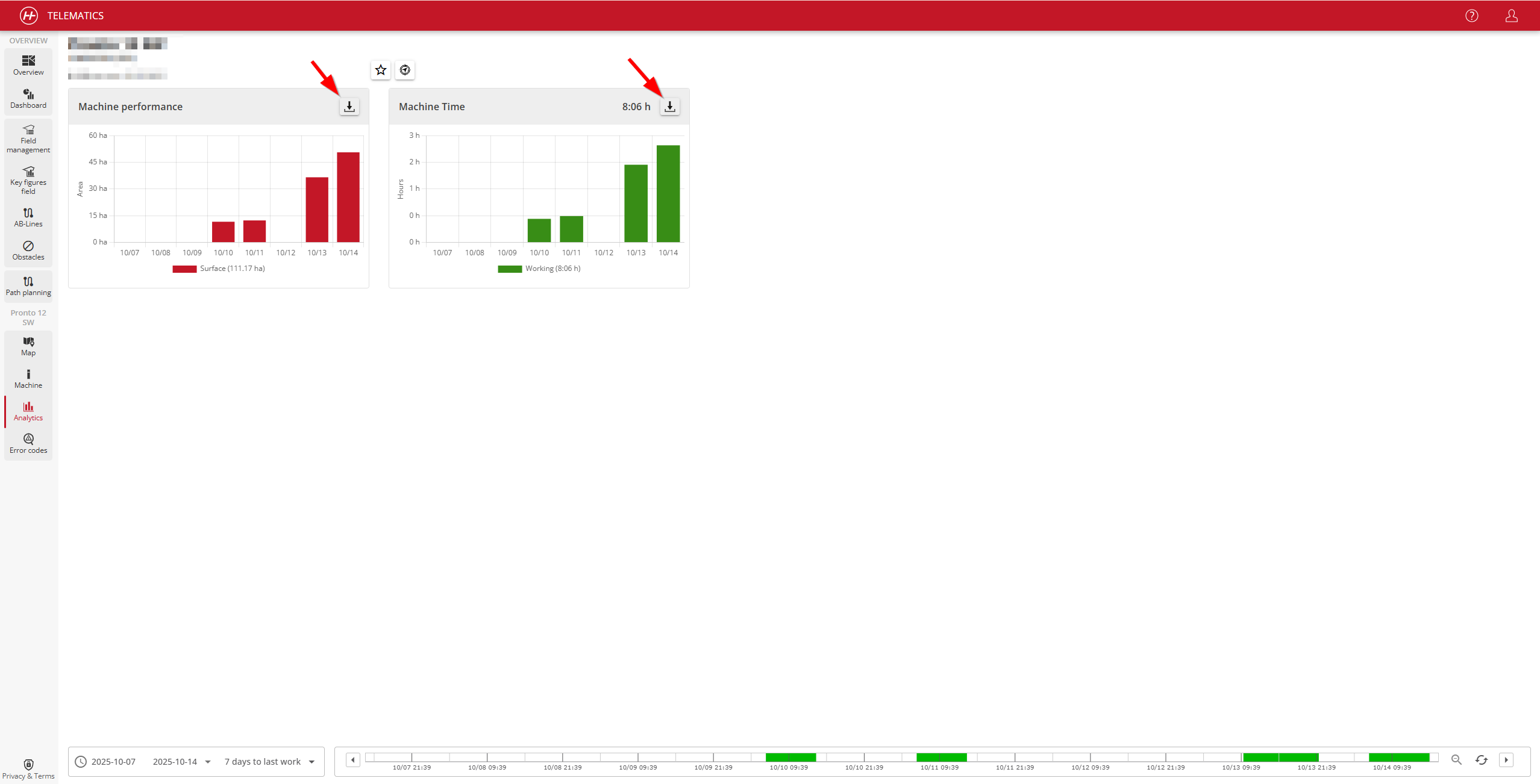 Für detailliertere Auswertungen kann unter dem Reiter Analytics Balkendiagrame zu Flächenleistung und Arbeitszeit der Maschine im gewählten Zeitraum eingesehen werden. Mithilfe dieser zeitlichen Einschränkung kann ein Arbeitsvorgang bzw. Saison genauer betrachtet werden (Bild 5.2.1). |
